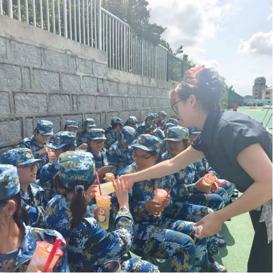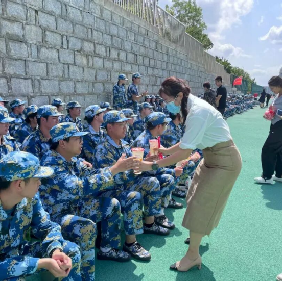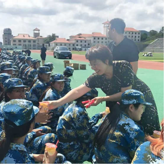 军训场地,学院党委副书记夏艳玲亲手将一杯杯清爽解渴的柠檬水递到同学们手中,细致询问训练进度、身体状况与生活需求;学院党委副书记杨春娟与大家亲切交流,反复叮嘱大家在刻苦训练的同时,务必做好防暑降温,及时补充水分;辅导员老师们也提到“有需求随时找学院”,确保同学们以饱满的精神状态投入军训。